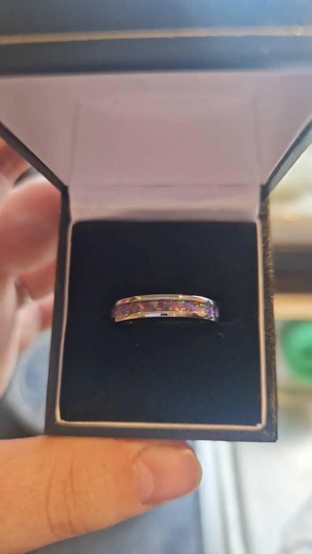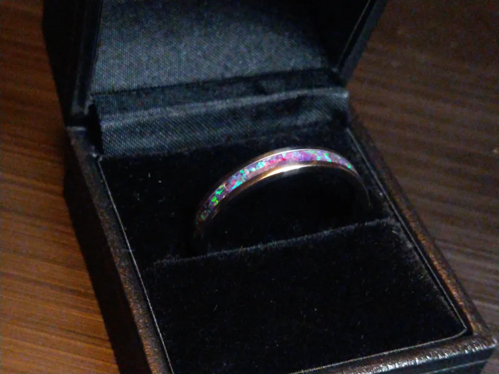 The lab-grown purple opals are chemically identical to their naturally mined counterparts, but are designed to enhance their vibrant iridescence. Hand-set in crystal-clear, durable resin, the opals seamlessly complement the mirror-polished stainless steel core. With a hardness of 5.0-6.5 on the Mohs scale, the stainless steel ensures your ring will retain its luster and resist scratches far longer than sterling silver.