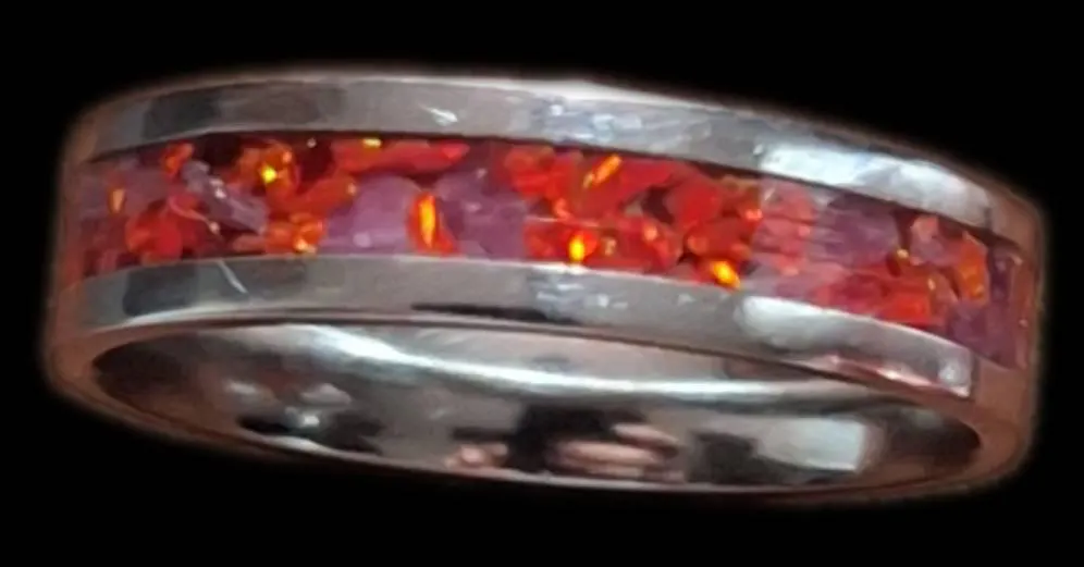 The stunning red opals are lab-grown, chemically identical to natural opals, crafted to enhance their vibrant iridescence. Each stone is meticulously set in durable, crystal-clear resin, creating a seamless design with a mirror-finish 6mm stainless steel core.