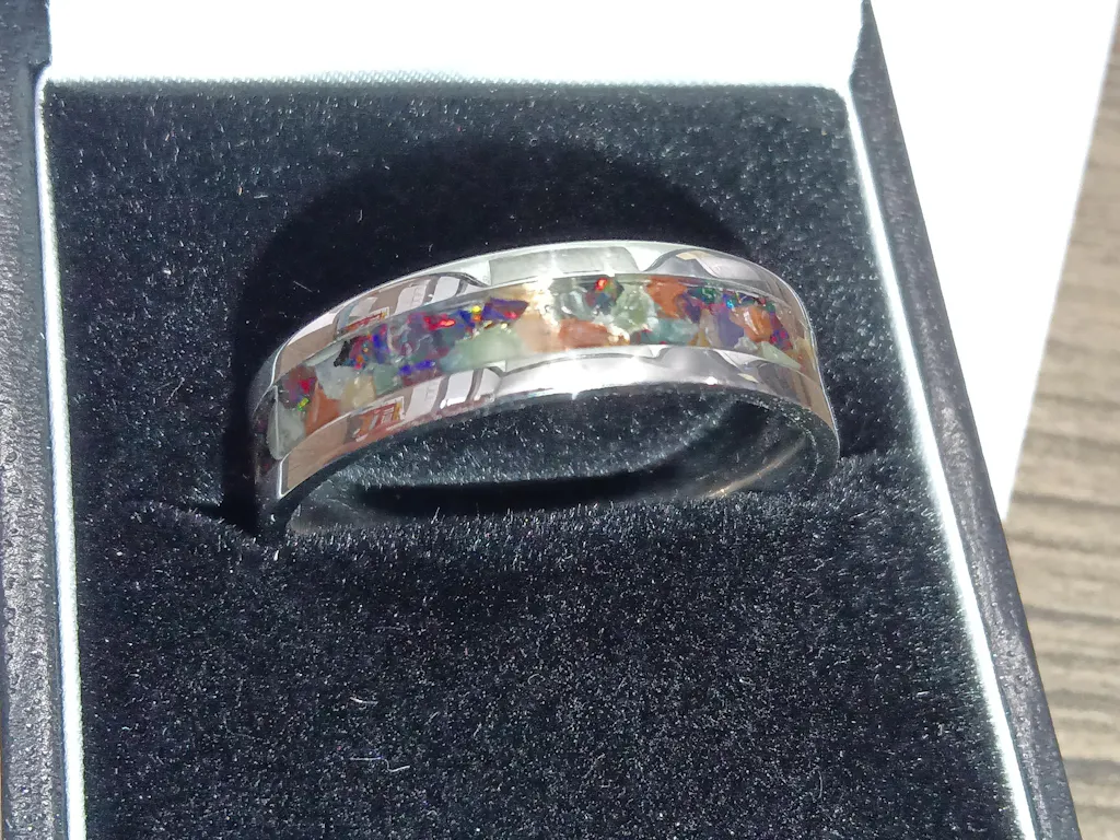 The exquisite blood opals are lab-grown, chemically identical to naturally mined opals, and crafted to showcase their stunning iridescence. Each opal is hand-set in a crystal-clear, durable resin, creating a seamless design complemented by a mirror-finished stainless steel core.